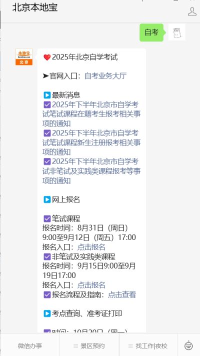 温馨提示:微信搜索公众号【北京本地宝】,关注后在对话框回复【自考】获北京高等教育自学考试2025年下半年报名时间、报名入口、准考证打印时间及入口、考试时间安排、成绩查询时间及入口等。