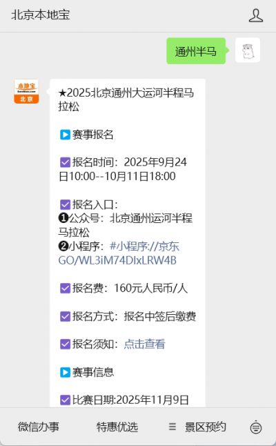 》》2025北京通州半程马拉松志愿者报名指南(时间+入口+要求)温馨提示:微信搜索公众号【北京本地宝】,关注后在对话框回复【通州马拉松】获2025北京通州运河半程马拉松报名入口、报名时间、赛事时间地点、赛事规模、竞赛规程等。