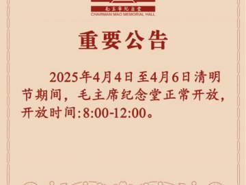 3月28日,“毛主席纪念堂”微信公众号发布清明节开放公告:2025年4月4日至4月6日清明节期间,毛主席纪念堂正常开放,开放时间为8:00-12:00。