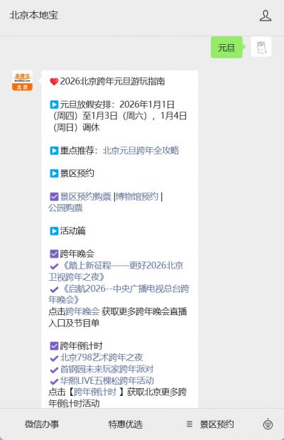 温馨提示:微信搜索公众号【北京本地宝】,关注后对话框回复【元旦】或【跨年】可获2026北京跨年倒计时/灯光节/无人机秀、跨年演唱会/新年音乐会、元旦红包封面、景区预约购票、市属公园/博物馆展览活动等超全攻略。