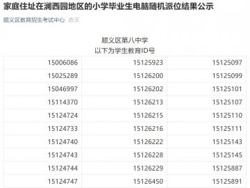 2021年顺义区家庭住址在澜西园地区的小学毕业生电脑随机派位结果公示了,进入顺义区第八中学、顺义区第三中学的学生的教育ID号见表格。