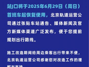 目前已完成改造施工,平安里站]口将于2025年6月29日(周日)首班车起恢复使用,北京轨道运营公司通过张贴车站通告、媒体新闻及官方新媒体渠道广泛发布,便于您提前规划出行路线。