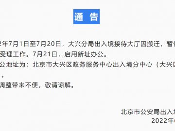 2022年7月1日至7月20日北京市公安局出入境管理局大兴分局搬迁,暂停各类出入境证件受理,具体内容详见正文。