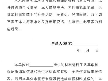 本人郑重承诺所填写信息和提供材料均真实有效,无任何虚假申报情况,本人遵纪守法,无刑事犯罪记录,未参加过国家禁止的社会活动,无政治、经济问题。以上如不真实本人愿意永久放弃申报资格,并承担由此带来的相应后果。